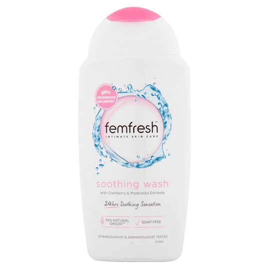 Femfresh Ultimate Care Soothing Wash (250ml) Intimate Daily Vaginal Feminine Hygiene Shower Gel Cleanser pH Balanced, Soap Free w.Hydrating Cranberry & Probiotics Extract, Long-Lasting MULTIActif Aaaah… and relax. Get that pampered feeling with these pH balanced soothing suds. The specially designed formula contains probiotics to help stimulate skin's natural defences and the cranberry and cornflower extracts gently hydrate. Then the MULTIActif complex leaves you feeling fresh all day, every day.