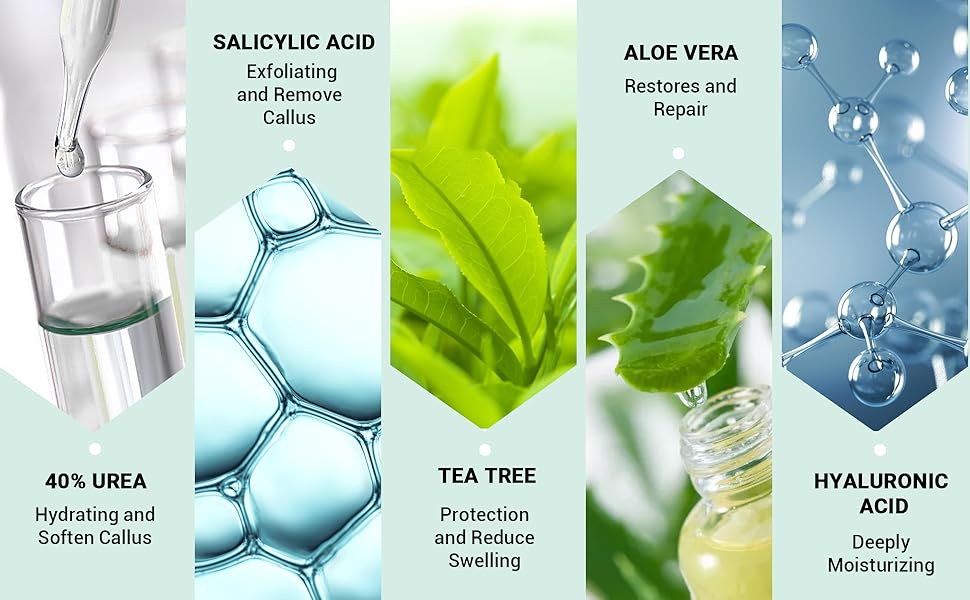- 【Multi-Function from Premium Ingredients】Our urea cream is combined with other effective ingredients. Tea Tree protects the skin and reduces the swelling; Aloe Vera restores the skin barrier and repairs the callus area; Hyaluronic Acid deeply moisturizes the skin and reduces dryness.